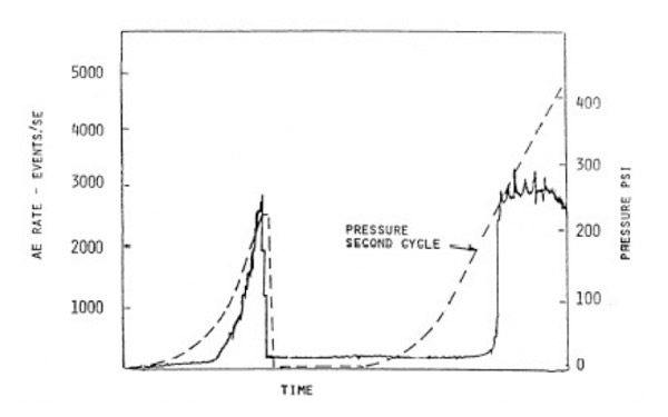 岩石的声发射活动能够“记忆”岩石所受过的最大应力,这种效应为凯塞尔效应。凯塞尔效应表明,声发射活动的频度或振幅与应力有一定的关系。在单调增加应力作用下,当应力达到过去已施加过的最大应力时,声发射明显增加。Kaiser效应的物理机制可认为岩石受力后发生微破裂,微破裂发生的频度随应力增加而增加,破裂过程是不逆的,但是由于已有破裂面上摩擦滑动也能产生声发射信号,这种摩擦滑动是可逆的。因而加载时应力低于已加过的最大应力也有声发射出现,它们就是那些可逆的摩擦滑动引起的声发射事件。当应力超过原来加过的最大应力时,又会有新的破裂产生,以致声发射活动频度突然提高。声发射凯塞尔效应实验可以测量野外曾经承受过的最大压应力。该类实验一般要在压机上测定单向应力。在加载过程中声发射率突然增大点对应着的轴向应力是沿该岩样钻取方向曾经受过的最大压应力。