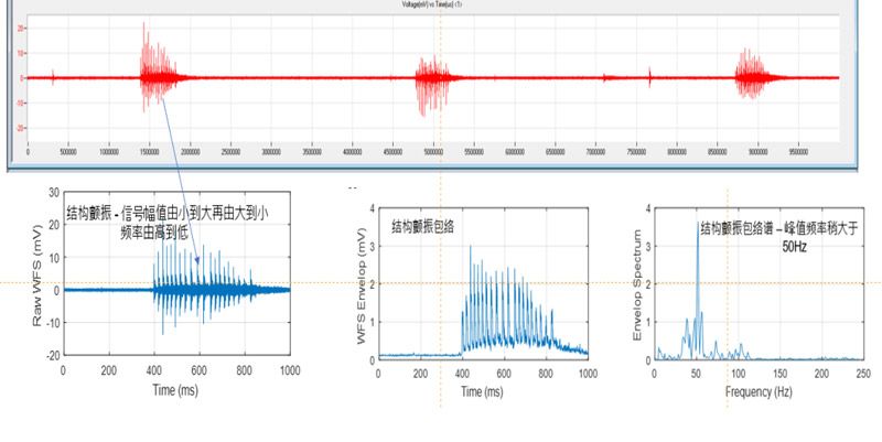 · 波形流信号全域特征分析。声发射监测还可在风机叶片监测过程中不定期的以高速采集波形流信号以从最原始的声发射信号中观察、分析、判断、提取各种可能的时域、频域及其它信号转换空间的特征。这是一种全域分析法。可以从各个角度分析观察数据,由此发现新的可能情况或完善、补充、证实其它分析方法的结果。