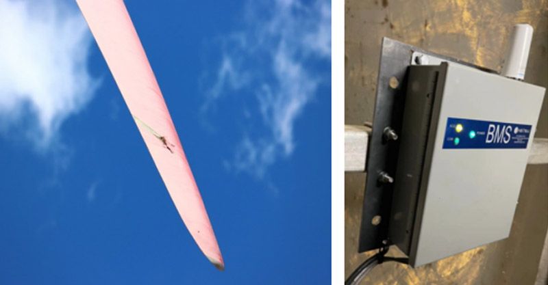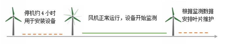 在风机叶片上安装声发射传感器,叶片的损伤处在风机转动过程中发出弹性波,被传感器捕捉到,再经过数据分析和处理,就可以实现对整个风机的叶片进行监测。