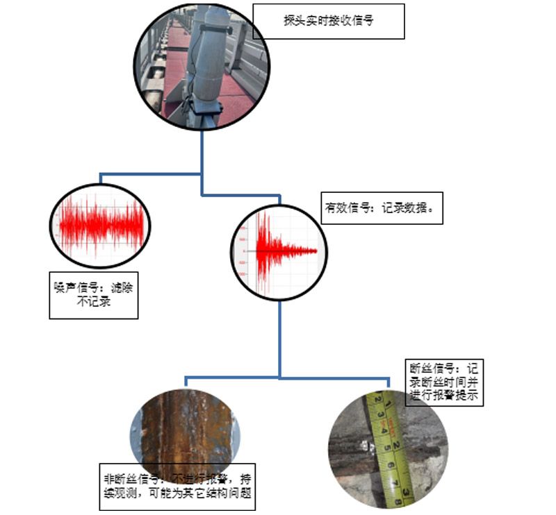 基于我公司的多年“断丝”监测经验(室内测试、现场监测),形成了专有的断丝监测方案(含专用断丝监测传感器、断丝监测传感器布置方案、断丝监测主机、断丝信号识别算法),实现对断丝信号发生的时间、断丝发生位置、断丝发生数量(监测期间内)的采集和报告。