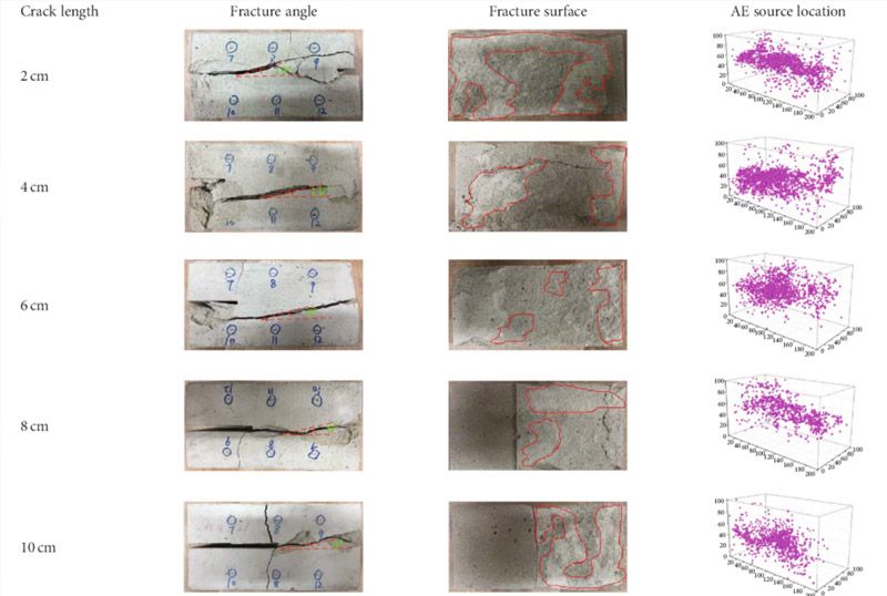 尺寸为200x100x100mm的混凝土试样,试样上有不同长度的预制裂纹,预制裂纹宽度4mm。在剪切试验过程中,利用声发射技术对缺陷进行信号定位,从而判断混凝土内部的损伤过程。