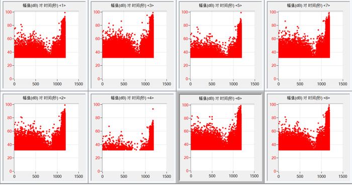图2是各个通道幅值vs时间散点图,从中可以看出,前期损伤不明显时,信号幅值较低,通常在60dB以内;1000秒左右开始剧烈损伤,产生的信号幅值较高,在60-90dB。