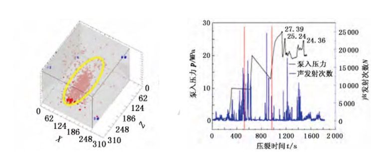 试样损伤三维定位/试样压裂的压力-时间-声发射计数曲线