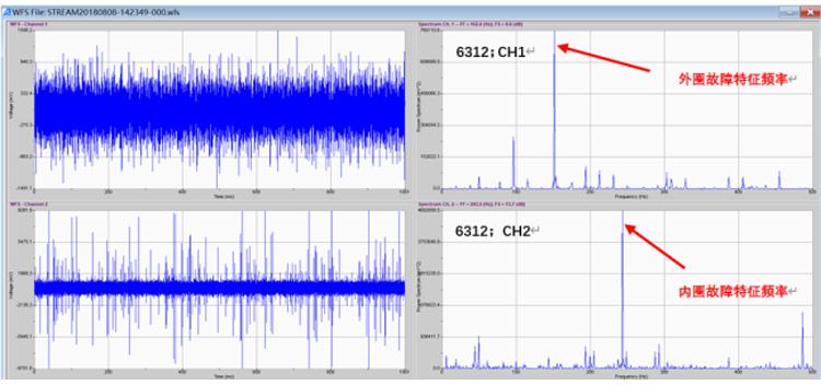 通过对采集到的波形流进行时域、频域分析发现,时域存在明显周期性信号,轴承1频域上反应出来的特征频率为152Hz,该频率与外圈故障频率完全吻合;轴承2频域上反应出来的特征频率为243.5Hz,该频率与内圈故障频率非常接近;所以可初步断定为轴承1为外圈故障,轴承2为内圈故障。