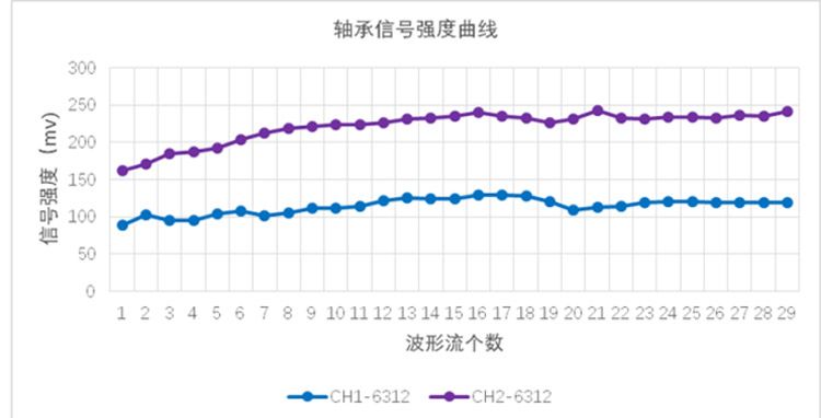 通过对采集到的波形流信号强度分析发现,通道1对应的6312轴承信号强度要比通道2的6312轴承的信号强度小很多,通道1对应轴承信号强度与轻微故障轴承(后续6313轴承)信号强度水平相当,但是通道1、通道2对应信号强度都明显小于试验一两个通道对应的信号强度,所以在通道1对应6312轴承属于轻微外圈故障,通道2对应的6312轴承属于中度内圈故障。