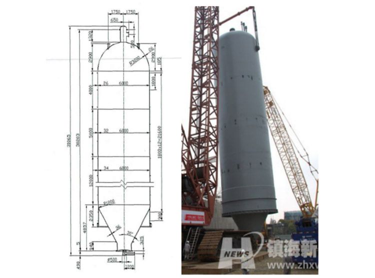 整个塔体由裙座支撑,裙座与塔体锥形封头处采用搭接焊接的连接方式。焦炭塔自上而下共由11节筒节焊接而成。其结构尺寸如图所示:
