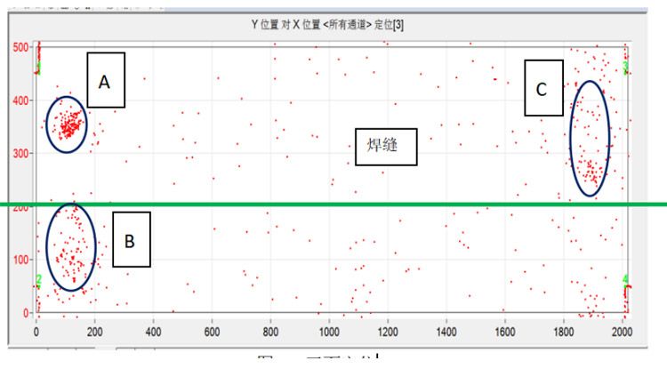 1) 通过15天的数据能看出,在定位图中发现3块定位集中区域,其中C区域处在疲劳裂纹区域;A、B区域为新发现的声发射源区,需要进行重点关注,疑似缺陷源区。要密切关注之后各区域的变化状况及是否有新的定位区域的产生。