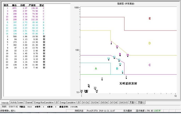 由以上强度分级可知:1,3,8,10,15通道需要进一步的无损检测,由于本次声发射试验在该球罐的100%常规检测之后进行的,因此,以上通道传感器附件的焊缝可参考常规UT检测结果为准。