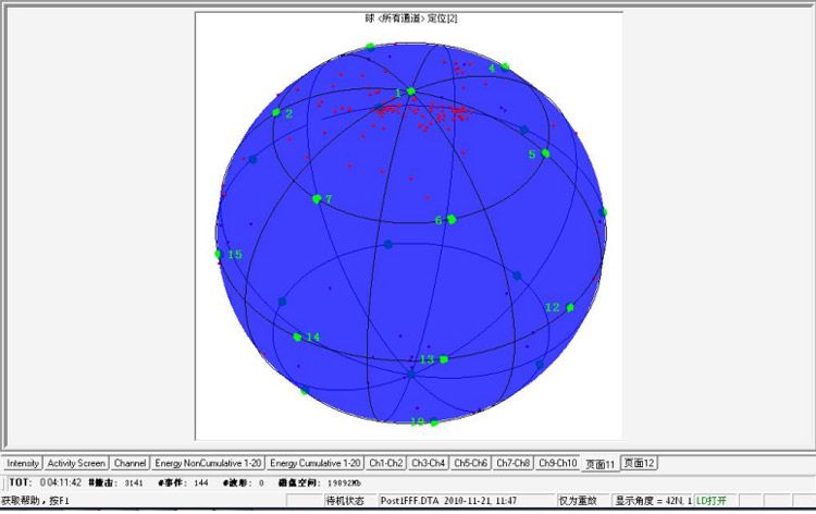 由附录中给出利用时差定位方法的球面定位示意图,可看出1通道存在大量的定位信号,这与现场实际试验情况有关,原因一:水压泵位于球罐顶部,即通道1探头处;原因二:水压泵的操作人员必须实时操作水压泵。因此造成通道1探头处存在大量定位信号。但MonPAC的检测结果分析采用区域定位方式,同时通过专用的数据处理方法可尽量滤除非真实的AE信号,因此得到上述结果,即通道1为C级。
