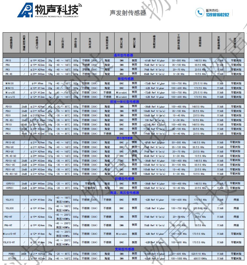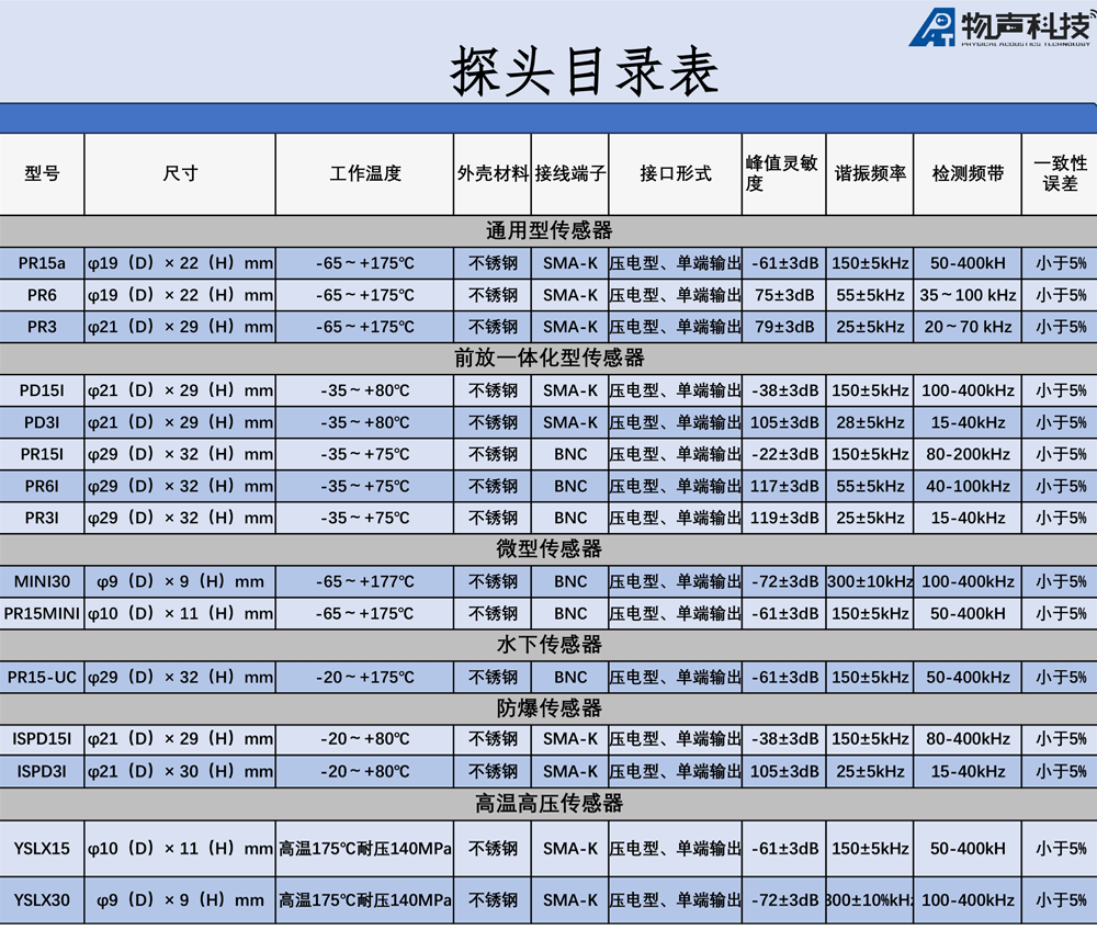 谐振型:特定谐振频率(如150 kHz),灵敏度高,适用于工业检测。